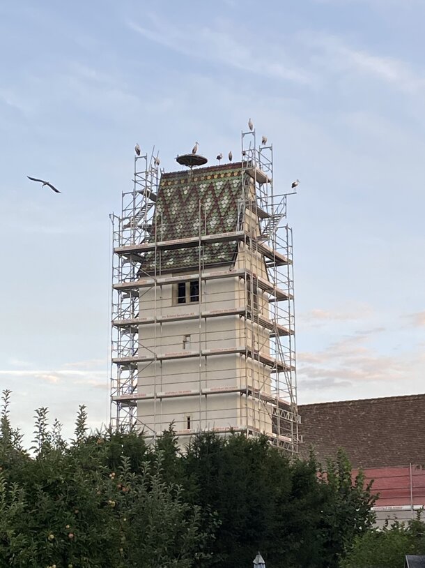 Nun geht es gut sichtbar vorwärts. Einige Teile der Fassade erscheinen wieder in einer Farbe, die wir schon lange nicht mehr gesehen haben: weiss! Da ich daran so Freude hatte, hier ein paar Fotos der Kirche vor dem Wetterumschwung. Ausserdem kann man im richtigen Moment auch viel schaulustige Störche beobachten. Ob sie auch die neue Farbe so lieben oder eher das Baugerüst?