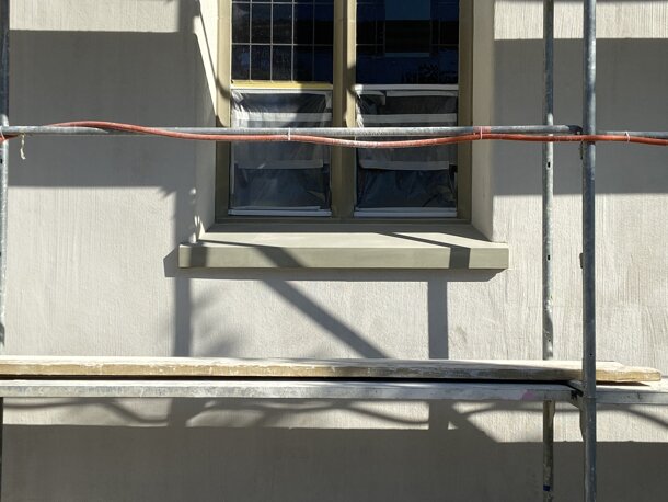 Es ist wieder viel gegangen in der letzten Woche. Die gesamte Fassade ist nun wieder schön weiss und der Verputz ist am trocken. Dies wird ein paar Wochen in Anspruch nehmen. Schön sieht man auch die neuem Sandsteinbänke, welche nun wieder aus der Fassade vorstehen.