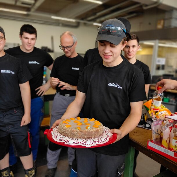 Bei uns in der Werkstatt der Berufsschule Lenzburg gibt es ein Ritual, das sich inzwischen fest etabliert hat: Immer dann, wenn am Küttiger Rüebli gearbeitet wird, gibt es eine Rüeblitorte zum Znüni. Die Torte wird jedes Mal von der Mutter unseres Fachlehrers Martin Christen aus dem Kanton Nidwalden gebacken. ❤️ Also: Ein riesiges DANKE an dich! Die Stimmung in der Werkstatt? Richtig gut. Wir kommen voran. Und man sieht inzwischen echt etwas. Lisa und Lena haben das Kraut oben am Rüebli geschweisst. Das wird irgendwann grün lackiert und sieht schon jetzt super aus. Morgen werden die Ringe auf die Unterkonstruktion geschweisst. Die halten später all die Aluminiumplättli, auf denen eure Namen eingraviert werden. Und zwischendurch? Natürlich Rüeblitorte. ? Warum wir jetzt Aluminium statt Messing verwenden Ursprünglich wollten wir Messingplättli auf die Unterkonstruktion machen. Um das zu testen, haben wir einen Prototyp gebaut. Dabei haben wir gemerkt: Messing ist viel zu sperrig. Das Vernieten wäre fast unmöglich geworden. Aluminium hingegen ist dünner, leichter zu bearbeiten und lässt sich perfekt auf die Unterkonstruktion nieten. Also: rostfreies Aluminium – perfekt für ein Namensplättli. ? Gibt es eigentlich jemand, der seinen Namen auf dem Plättli haben möchte, das dann auf das Rüebli montiert wird, welches wiederum dann beim Dorfeingang steht? Wenn ihr uns unterstützen wollt: Damit wir das Projekt fertigstellen können, freuen wir uns über jede Unterstützung. Alles geht direkt in Material, Werkzeuge und die Arbeit, die wir Lernenden hier reinstecken. https://www.lokalhelden.ch/kuettiger-rueebli-ein-kunstprojekt Danke fürs Lesen, fürs Teilen und für alle, die uns schon unterstützen. Ein grosses Dankeschön – und einen dicken Kuss. ?