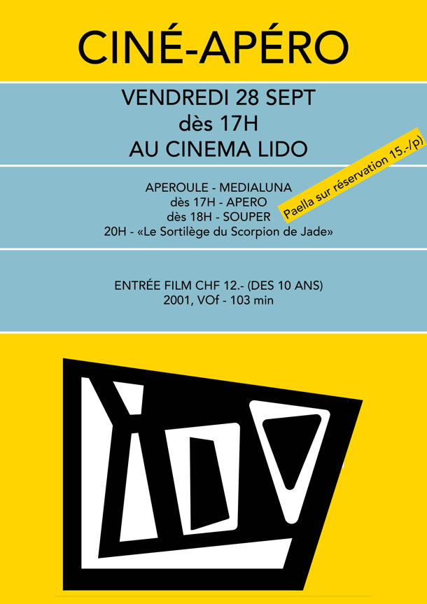 Ce Vendredi au LIDO: Dès 17h: apéro avec l' Apéroule Dès 18h: Tapas et repas avec Medialuna Street Food PAELLA SUR RESERVATION 15.-/personne Dès 20h: Projection du film "Le Sortilège du Scorpion de Jade", 2001, Woody Allen, VOsf, dès 10 ans Pas d'obligation de venir voir le film pour venir faire l'apéro, et vice-versa!