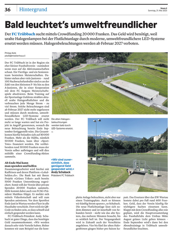 LIEWO: Der FC Trübbach sucht mittels Crowdfunding 20'000 Franken. Das Geld wird benötigt, weil uralte Halogenlampen bei der Flutlichtanlage durch moderne, umweltfreundlichere LED-Systeme ersetzt werden müssen. Halogenbeleuchtungen werden ab Februar 2027 verboten.