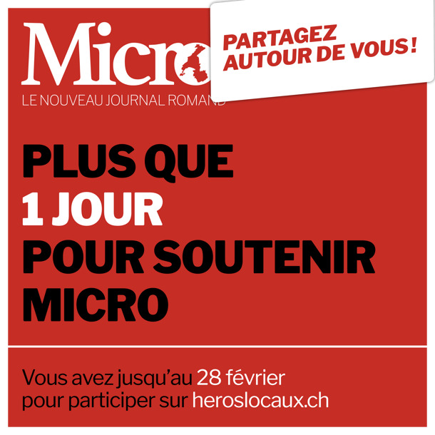 Il ne reste plus que 38 heures pour soutenir Micro! C'est donc le moment ou jamais d'en parler autour de soi, par exemple en partageant le visuel ci-joint par mail, par WhatsApp ou encore sur les réseaux sociaux. Un immense merci à tous de votre soutien durant ce financement participatif, sans vous rien de tout cela n'aurait été possible! Très belle journée, L'équipe Micro PS: Ce soir nous serons à Sion, au café du Nord, dès 18h30 pour notre séance de rédaction. Venez!