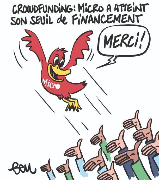Chers parrains, Toute l'équipe de Micro vous remercie chaleureusement de votre soutien durant cette première semaine de folie! Grâce à vous, nous avons déjà récolté près de 60 000 francs. Nous sommes épatés de voir notre projet être accueilli aussi favorablement et très fiers de la confiance que vous placez en nous. Vos contributions prouvent que, comme nous, vous êtes convaincus de la nécessité de voir un nouveau journal trôner sur les tables des cafés-restaurants romands dès le printemps prochain. Pour y arriver, nous avons encore besoin d'un petit coup de pouce de votre part. Vous êtes désormais nos premiers ambassadeurs et ce serait génial si vous pouviez parler de Micro aussi largement que possible autour de vous, que ce soit de vive-voix, par mail ou sur les réseaux sociaux. Si nous atteignons le seuil minimum de 90 000 francs le plus rapidement possible, nous pourrons ensuite tenter de nous rapprocher au maximum de notre objectif idéal qui est de 250 000 francs. Cet argent garantirait l'existence de Micro pendant une année entière et donnerait une base beaucoup plus solide à notre projet. Encore une fois un immense merci de votre soutien, Toute l'équipe Micro PS: Veuillez nous excuser si vous avez reçu ce message à double, il s'agit d'une erreur technique.