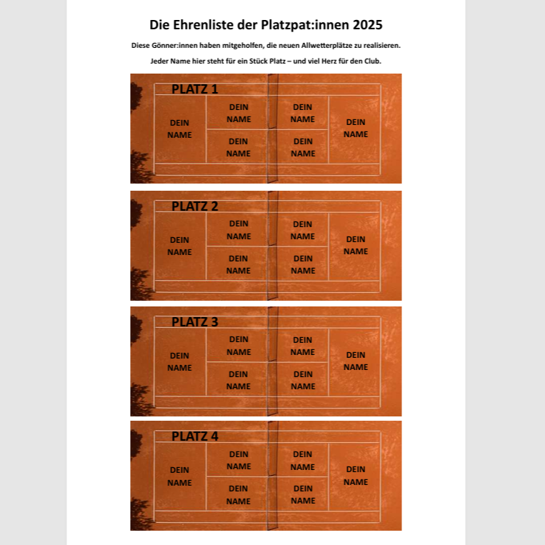 Die eingehenden Spenden werden zwar nur einen Teil der Gesamtkosten für die neuen Tennisplätze decken können, doch sie leisten einen wertvollen Beitrag zur Stabilität unserer Clubfinanzen. Der verbleibende Betrag wird durch Sponsorengelder, Eigenmittel sowie ein Bankdarlehen aufgebracht.