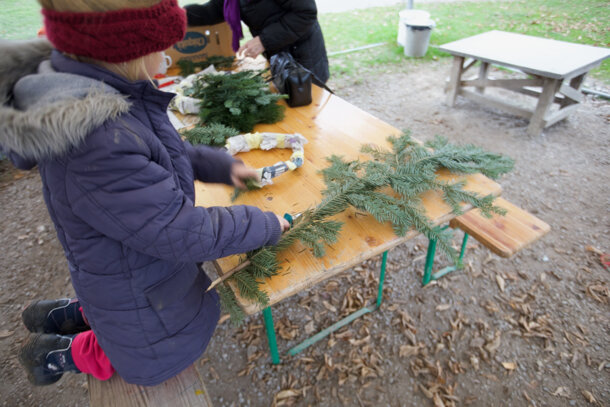 Trotz des starken Nebels und der kühlen Temperaturen kamen viele Kinder, Mütter und Grosseltern auf den Robinsonspielplatz Wetzikon. Beim traditionellen Kranzen wurde eifrig gearbeitet und geschmückt. Einige Kinder machten ihre Hütten winterfest oder bastelten an Weihnachtsgeschenken.