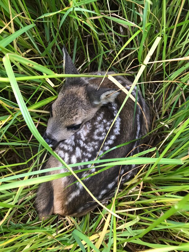 Seit zwei Jahren rette ich aktiv Rehkitze. Letztes Jahr konnten wir ca.15 Rehkitze vor dem Mähtod retten, was für mich eine sehr erfreuliche Bilanz ist und ein schönes Erlebnis.