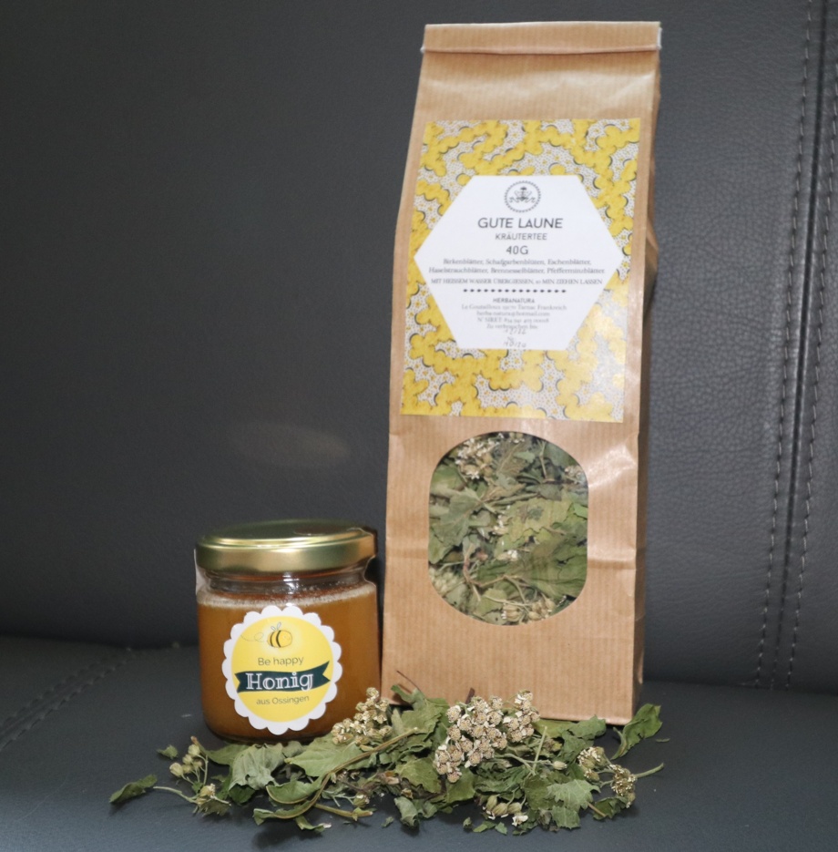 Dieser Kräutertee besteht aus Schafgarbe, Brennnessel, Pfefferminz, Birken-, Eschen- und Haselstrauchblätter. In Handarbeit im Biobetrieb auf einem Hochplateau in Frankreich von Schweizern angebaut. Die Tees konnten wegen der Pandemie nicht auf Märkten verkauft werden. Das Teehüsli Drewi in Kleinandelfingen hat um den Betrieb zu retten den Bestand aufgekauft. Wir freuen uns beim Verkauf zu helfen.