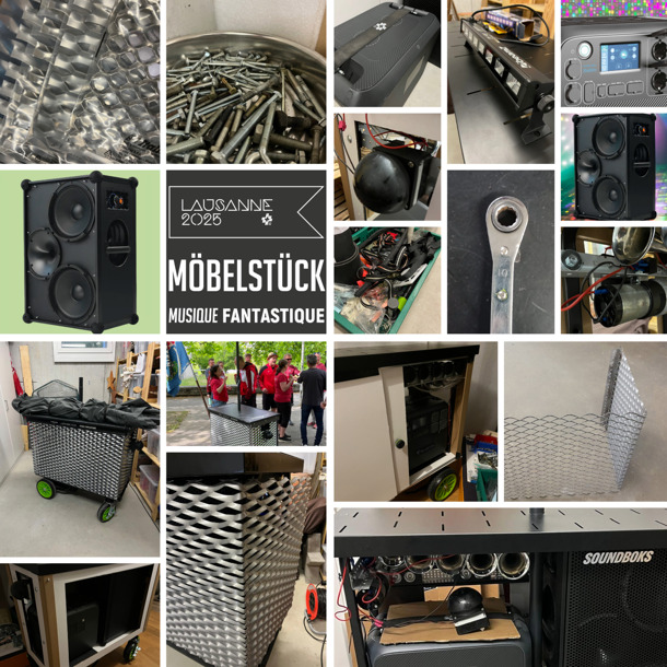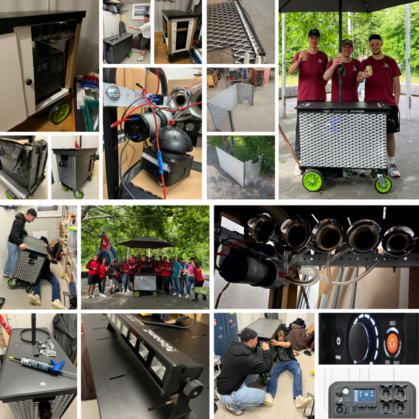 Unser neues Soundmobil glänzt nicht nur mit seinem verchromten Look, sondern ist auch nachts ein echter Hingucker. Für den richtigen Sound sorgt der leistungsstärkste Bluetooth Speaker auf dem Markt. Mit bis zu 126 dB, einer Akkulaufzeit von 40 Stunden bei mittlerer Lautstärke (6 Stunden bei voller Lautstärke) und einem Zusatzakku sind wir bestens ausgestattet. Die Power Station liefert mit über 2000 Wh und ihren 28 kg Kampfgewicht genug Energie für Musik und Licht. Ein besonderes Highlight ist das Fünfklang-Horn mit Sicherheitsschalter. Die „La Cucaracha“-Melodie sorgt per Buzzer für Stimmung und bringt die Scheiben zum vibrieren. Das Streckmetall wurde fachmännisch aus einem Stück gefertigt, professionell verschweisst und verchromt, «Bling-Bling»-Effekt inklusive! Die Lightbar taucht die Nacht in bunte Farben, die im Takt der Musik leuchten. Auch das musikgesteuerte UV-Licht darf natürlich nicht fehlen. Alle Komponenten wurden mit viel Liebe zum Detail auf einen Bühnentechnik-Transportwagen montiert, geschraubt, gelötet, geklebt und perfekt angepasst. Oben gibt es einen Sonnenschirmständer und auf der Seite eine Halterung für unsere Vereinsfahne.