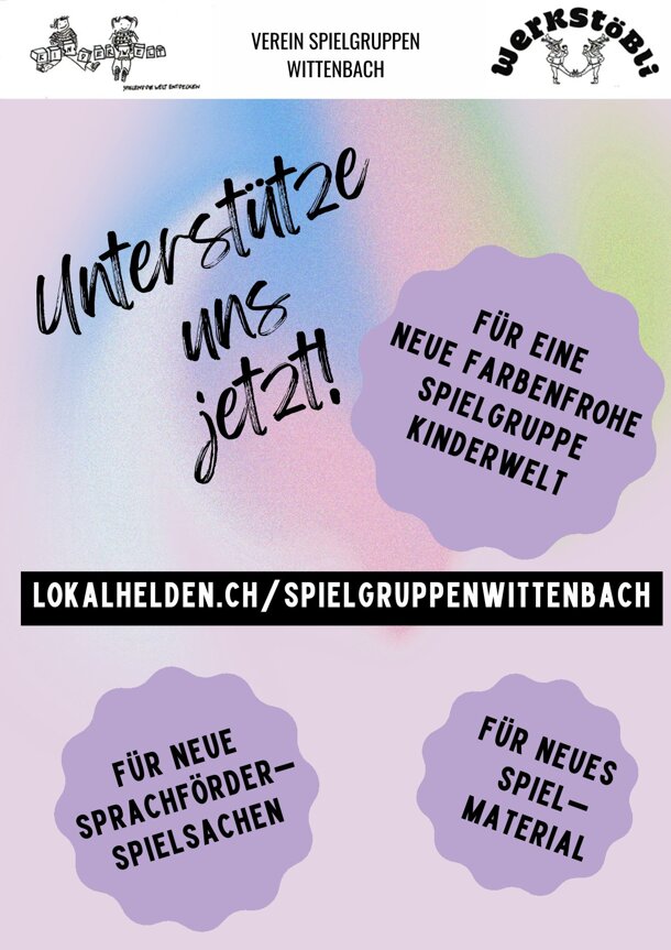 Liebe Fans und Unterstützer Vielen Dank, dass ihr unser Projekt unterstützt. Der Start läuft etwas "zäh". Darum bitten wir euch, weiterhin fleissig Werbung zu machen und eure Mitmenschen zum Spenden zu motivieren. Für eine lokale Spielgruppe, die einsteht für Integration, Förderung und gleiche Chancen für die Kleinsten unserer Gesellschaft! Vielen Dank für eure Mithilfe!