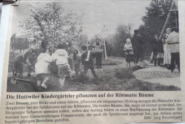 Seit fast 40 Jahren ist es möglich auf der Ribimatte an Geräten zu spielen. Nachdem engagierte Frauen des Gemeinnützigen Frauenvereines Huttwil schon längere Zeit die Idee eines Spielplatzes verfolgten, konnte 1985 die Spielstrasse Ribimatte eingeweiht werden. Bei einer Übung des Zivilschutzes wurden für Fr. 9'000.- Holzstämme in Geräte umgewandelt. Schon damals waren fixfertige Spielgeräte sehr teuer. Auch wollten die aktiven Frauen keine Plastikbauten auf der Ribimatte. Es galt bereits das aktuelle Motto: möglichst naturnah!