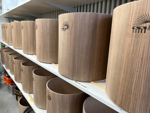 Danach gingen unsere Holztrommeln in Produktion. Wir haben uns beim Holzhändler die Nussbaum-Furniere für die Trommeln ausgesucht und die Trommelbauer haben sich ans Werk gemacht. Schon bald erreichten uns die ersten Bilder der rohen Holzzargen - und unsere Vorfreude stieg ins Grenzenlose.