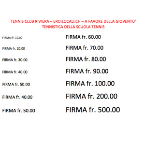 Perchè quando si tratta di aiutare i giovani che praticano sport, chiunque deve essere contento e fiero di poterlo fare. Inoltre sostenendo questo progetto con un minimo di CHF 10.- è possibile apportare la propria firma su un banner che verrà posizionato vicino ai campi da Tennis. Più grande sarà la tua donazione e più grande sarà la tua firma sul cartellone dei sostenitori.