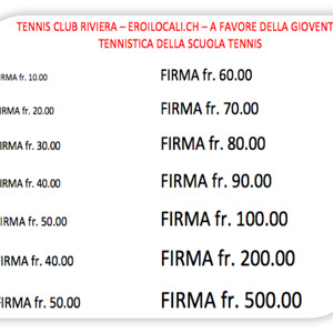 Aiutare a finanziare le infrastrutture per la pratica del tennis della Società Tennis Club Riviera. Inoltre sostenendo questo progetto con un minimo di CHF 10.- è possibile apportare la propria firma su un banner che verrà posizionato vicino ai campi da Tennis. Più grande sarà la tua donazione e più grande sarà la tua firma sul cartellone dei sostenitori.