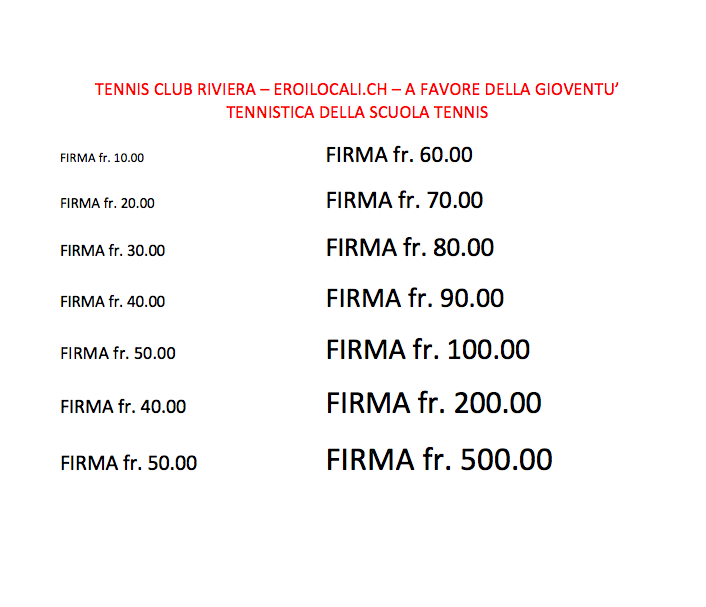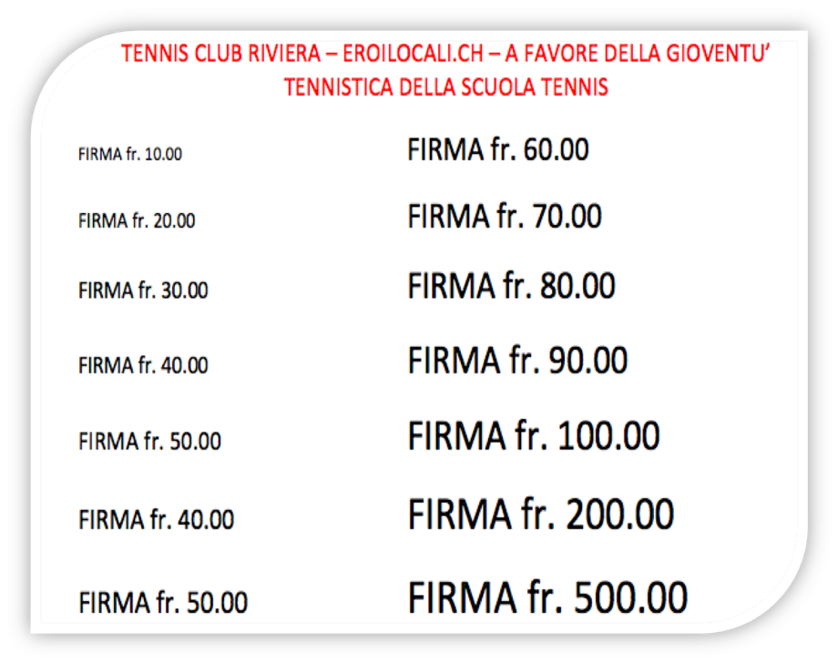 Apponendo la tua firma sul nostro banner, aiuti la gioventù della nostra scuola e realizzi il nostro desiderio per aumentare le infrastrutture sportive che occorrono alla scuola tennis.