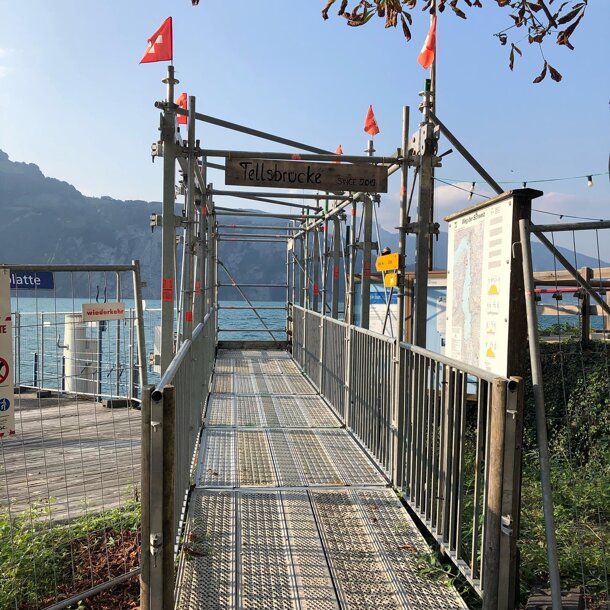 Nutzen Sie ein letztes Mal die Tellsbrücke bei der Schiffstation Tellsplatte. Am 25. September wird dieses wichtige Teilstück des Weg der Schweiz abgebaut und durch ein provisorium über die Seebeizli Terrasse ersetzt. Somit steht dem Baustart des neuen Schiffsanlegers nichts mehr im Weg...Am 29. September ist es soweit!!