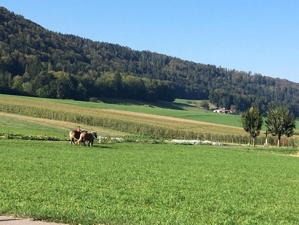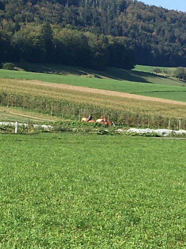 Aujourd'hui, je suis partie de la ferme des Esserts avec mon fils de 3 ans et les chevaux. Mon fils et moi sur Queras et Gilah à la longe. Objectif : aller jusqu'à Mervelier pour boire le café avec l'équipe Val Terbio. Nous sommes arrivés après 25 minutes de balade très tranquille. Les chevaux se sont super bien comportés et ils ont trouvé que le dépôt de Val Terbio était top pour se détendre et ne rien faire. Gilah a beaucoup baillé, excellent signe de relaxation.