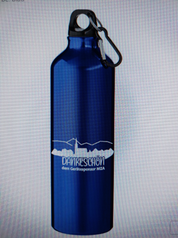 Trinkflasche mit Karabiner und Dankesemblem Gerätesponsor MZA
