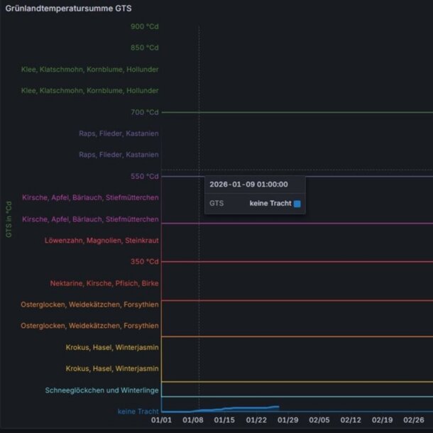 Habt Ihr Euch schon gefragt, warum die Bienen in manchen Jahren früher summen als in anderen? Die Antwort liegt in der Grünlandtemperatursumme. Sobald die Sonne den Boden im Frühjahr ausreichend erwärmt hat, erwacht das Leben. Die Natur beginnt zu arbeiten. Das ist der Fall wenn das „Temperatur-Konto“ einen Wert von 200 Grad erreicht hat. Die Natur bietet ab diesem Zeitpunkt genug Nahrung für die Bienen und deren Nachwuchs.