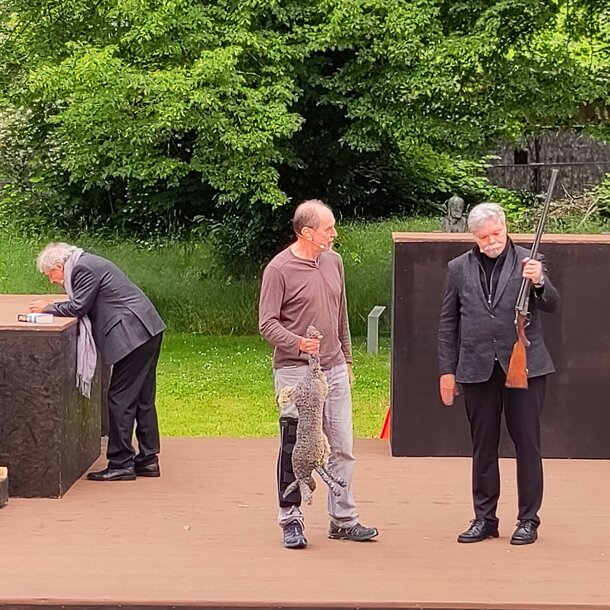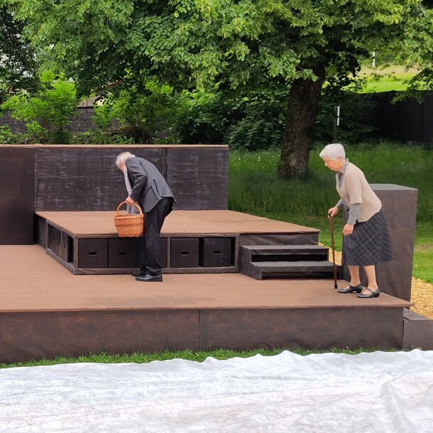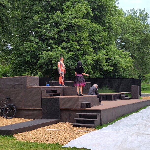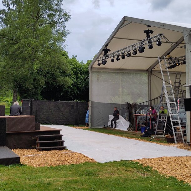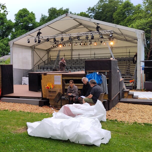 Die Tribüne steht, wir üben mit Headset, Kostümen und Leidenschaft.