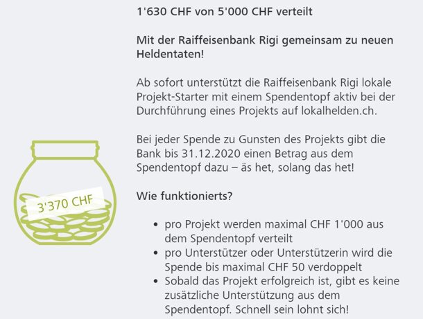 Auch die Raiffeisenbank hilft fleissig mit und verdoppelt die neuen Spenden bis max. 50 CHF. So wird die Raiffeisenbank Rigi 1000 CHF an unser Projekt beisteuern. Diesen Höchstbetrag wollen wir natürlich erreichen.