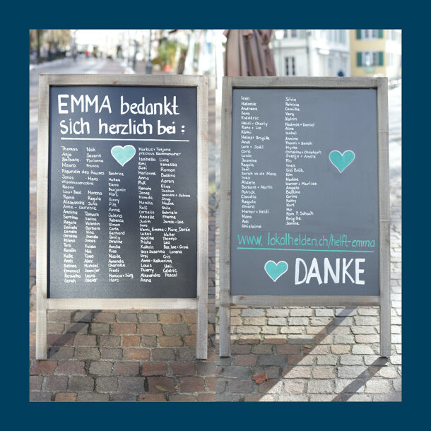 Liebe Unterstützer*innen Nach 20 Tagen ist unser Crowdfunding beendet. Von ganzem Herzen danken wir allen, die unser Projekt auf irgendeine Art und Weise unterstützt haben. Ihr habt EMMA eine Zukunft geschenkt! Es freut uns und macht uns unglaublich stolz, eine solche Unterstützung und Bestätigung erhalten zu haben. Wir werden mit viel Verantwortung und Sorgfalt mit den uns zur Verfügung gestellten Mitteln umgehen. Gerne informieren wir euch, wie es mit EMMA nun weiter geht. Sobald es wieder erlaubt ist, werden wir unser Lokal öffnen. Wir freuen uns schon jetzt darauf, euch bei uns begrüssen und persönlich danken zu dürfen. Vom Crowdfunding-Geld werden wir einen grossen Teil für die Bezahlung der entstandenen Fixkosten seit Dezember verwenden. Ebenso bilden wir Reserven, falls die Betriebsbeschränkungen ab Ende Februar weitergeführt werden. Es sieht ja momentan nicht allzu rosig aus. Trotzdem haben wir dank dem Lokalhelden-Projekt ein finanzielles Polster für die Zukunft. Wir haben uns dazu entschieden, einen Kultur-Topf mit einem Budget von CHF 4000 für Kulturprojekte im Zusammenhang mit EMMA zu unterstützen, welche unseren Gästen und Unterstützer*innen etwas zurückgeben. Ob eine öffentliche Lesung, Konzerte, ein Sponsoring oder eine Vernissage: Lasst euch überraschen! Falls wir nun zukünftig doch noch eine Unterstützung des Bundes erhielten, würde dieser "Kultur-Topf" dementsprechend aufgestockt. Und: nächste Woche informieren wir euch über eure Mercis Danke, danke, danke! Euer EMMA-Team