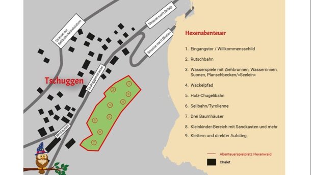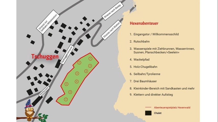 Der Wald-Abenteuerspielplatz Hexenzauber liegt im Wald beim Feriendorf Tschuggen, wenige Gehminuten von der Mittelstation der Luftseilbahn Blatten-Belalp entfernt.