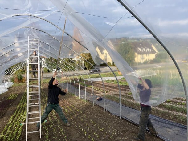 Wer in der Nähe wohnt, konnte in den vergangenen Monaten mitverfolgen, wie alles Gestalt annahm. Auf unserer Webseite wird die Geschichte in Bildern erzählt. Gemüsefelder, Wassersystem, Rüstraum und sogar das Folientunnel sind nun alle aufgestellt und in Betrieb!