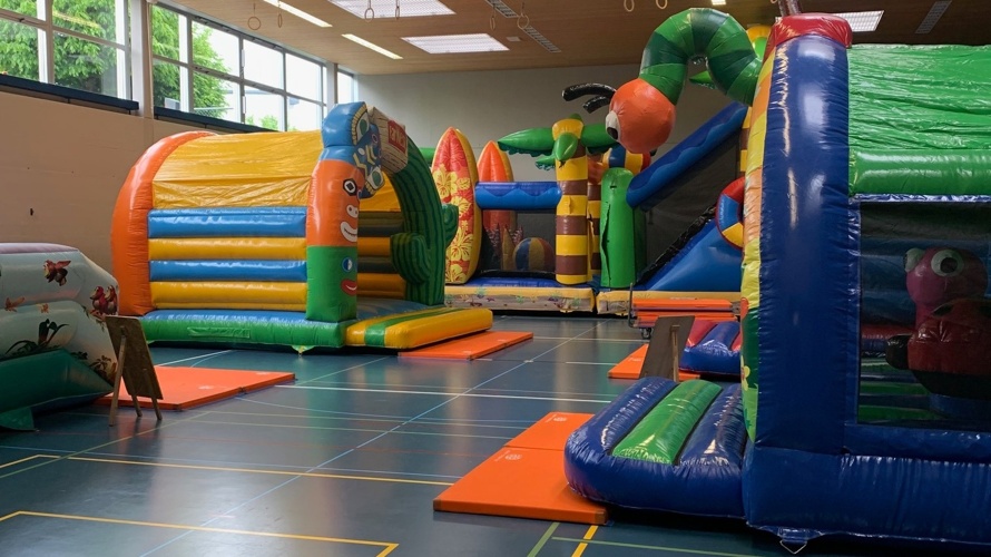 Eine Turnhalle voller, teils spektakulärer, Hüpfburgen.