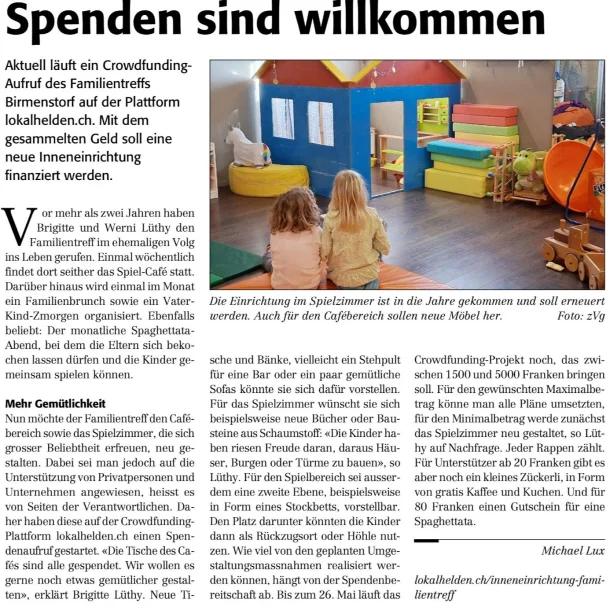 Liebe Fans und Unterstützer, Das Crowdfunding ist gut angelaufen. Aber wir brauchen weitere Unterstützungen, um unsere Finanzierungsschwelle zu erreichen und allenfalls sogar, die Erneuerung des ganzen Raumes zu ermöglichen. Wir sind froh wenn ihr unser Projekt im Freundes- und Bekanntenkreis weiter teilt. Wir danken für eure Unterstützung! Familientreff Birmenstorf-Gebenstorf