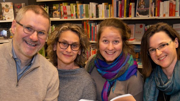 Das ganze Team der Gutenberg Buchhandlung, der Buchhändler und Inhaber André Wigger und die langjährigen Buchhändlerinnen Maja Scherrer, Mariann Gisler und Rosmarie Sutter.