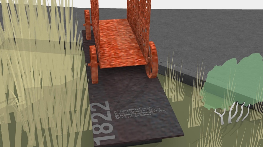 Es ist eine kleine Terrasse, die von der Straße aus gut zu sehen ist und auf die sowohl das historische Maison de Commune als auch das Coeur d'Or-Gebäude gerichtet sind, in dem die Chabag-Festivals stattfinden. Das Denkmal soll rechtzeitig zum Winzerfest 2019 eingeweiht werden.