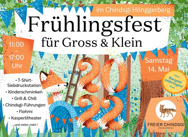 Nach pandemiebedingter zweijähriger Pause darf heuer unser traditionelles Frühlingsfest endlich wieder steigen! Wir laden dich zu uns in den Chindsgi ein. Komm vorbei und lass dich vom vielfältigen Programm überraschen: T-Shirt-Siebdruck Kinderschminken Kasperlitheater Flohmarkt Essen & Trinken ...und vieles mehr Gerne geben wir dir vor Ort weitere Informationen zu unserem Renovationsprojekt. Bei deinem Besuch kannst du dir gleich selbst ein Bild der geplanten Arbeiten machen. Adresse: Lebristweg 45, 8049 Zürich Anfahrt: Bus 80 bis Station «Hönggerberg» oder Bus 69 bis Station «Im Wingert» ( Fahrplan ).