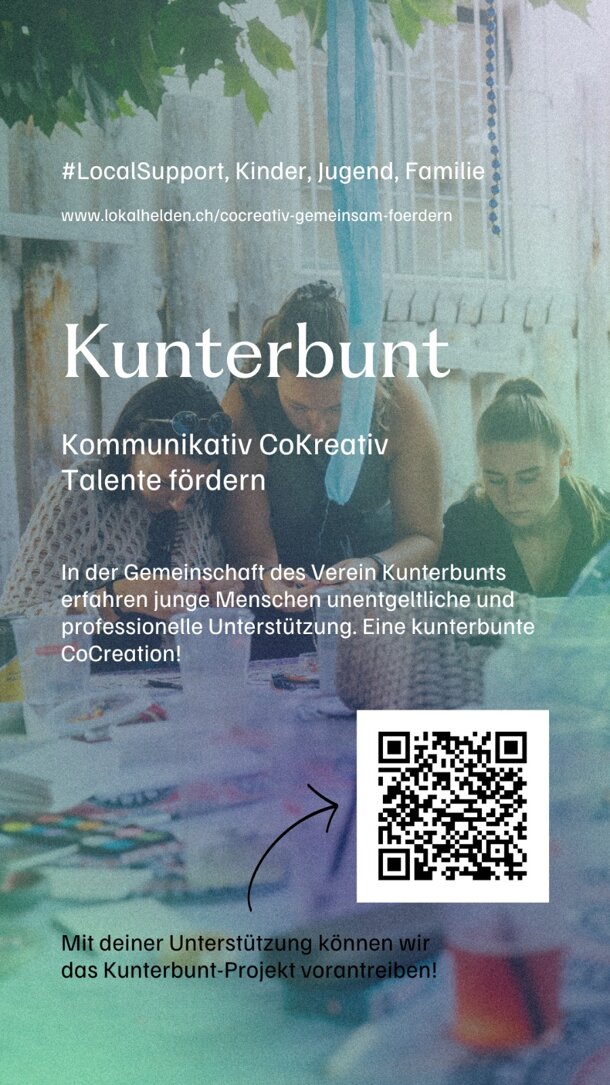 Hallo liebe Kunterbunt-Fans Vielen lieben Dank für eure großartigen Kommentare unter unserem Projekt. Wir sind überwältigt von eurer wertvollen Unterstützung und haben nun offiziell in die Finanzierungsphase gestartet. Ab heute kann jede und jeder für unser Projekt spenden. Jeder Betrag ist für uns von unschätzbarem Wert. Mit eurer Hilfe können wir gemeinsam jungen Menschen der Stadt St. Gallen und Umgebung Gemeinschaft wieder näherbringen. Bitte schickt unser Projekt euren Familien, Freunden, Bekannten und postet es fleissig in den Sozialen Medien. Danke für euer Engagement. Liebe Grüsse Euer Kunterbunt-Team