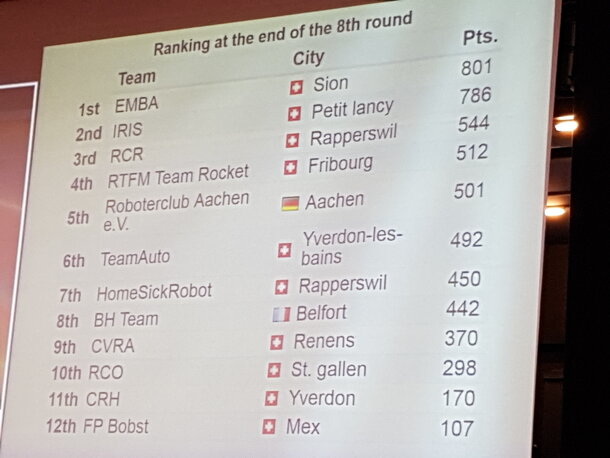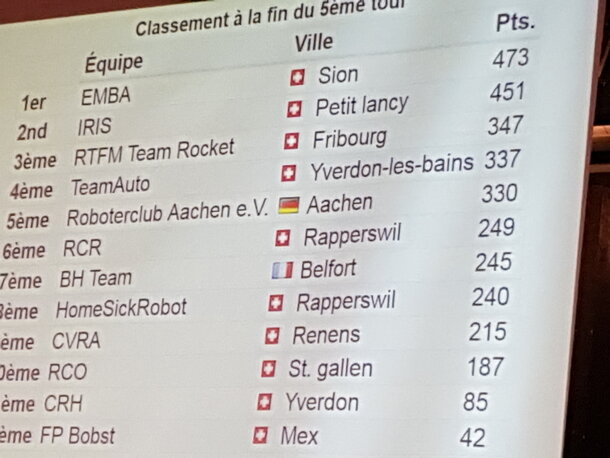Bonjour, , Nous sommes 7 ème de la coupe suisse. Belle performance de notre équipe (2ème après les qualifications), mais la compétition c est 50% technique et 50% de chance dans un tour final.... Je suis content, l'équipe et le robot se sont bien défendus ! On nous a demandé de faire des démonstrations avec IRIS9 cet automne, des news suivront Encore merci pour votre soutien à toutes et tous...