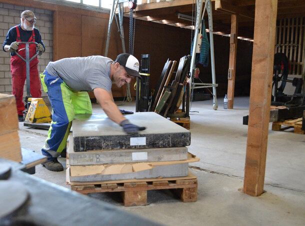 Gestern sind die Einzelteile der Presse auf vielen Paletten in der alten Cherzi in Hochdorf angekommen. Und wir haben das Bodenblech mit der Teerpappe darunter an der richtigen Stelle verlegt. Darauf wurde dann noch das Fundament mit den Seitenwänden gerollt. Willy Etter wird heute die Seitenwände herunternehmen und dann das Fundament genau platzieren und mit der Wasserwaage und Eichenholzkeilen wir es ganz genau ausgerichtet. Dann kann der Aufbau der Presse beginnen.»