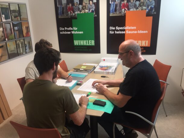 Es geht vorwärts mit der neuen Eingangstheke. Heute waren Bernie und Rolf bei der Schreinerei Winkler und wurden von Luca und Yanik herzlich empfangen und mit guten Ideen überrascht. Herzlichen Dank für diese Bereitschaft. Die Schreinerei Winkler Innenausbau AG ist seit vielen Jahren Donator und unterstützt uns immer wieder. Yanik als 4. Lehrjahr-Auszubildender und natürlich als Adliswiler, wird das Projekt massgeblich gestalten. Wir freuen uns, noch in der Adventszeit, das Resultat präsentieren zu können Eure Kulturschachtle