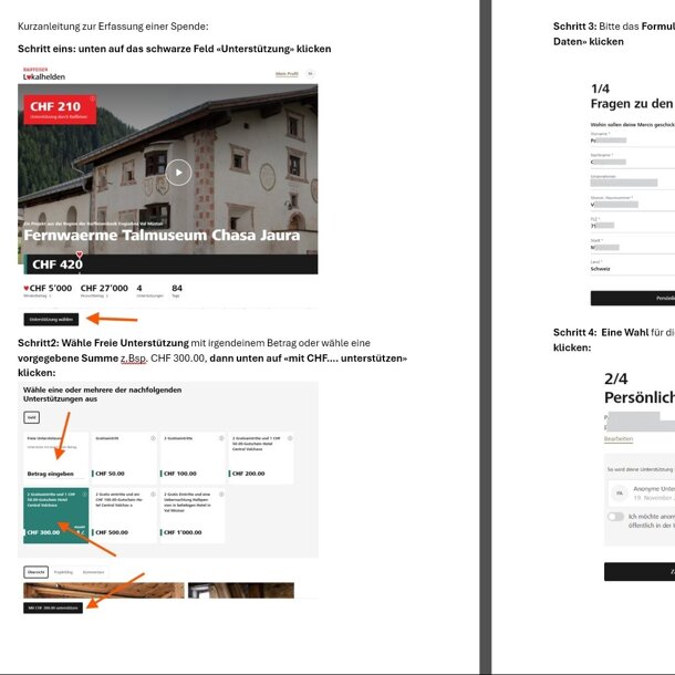 Kurzanleitung zur Erfassung einer Spende: Hier klicken um die Anleitung als PDF herunterladen zu können: https://www.mycloud.ch/s/S00F4B966DC08163ECF3A8D5D6EC34477B216298659 kurz: Schritt eins : unten auf das schwarze Feld «Unterstützung» klicken Schritt2: Wähle Freie Unterstützung mit irgendeinem Betrag oder wähle eine vorgegebene Summe z.Bsp. CHF 300.00, dann unten auf «mit CHF…. unterstützen» klicken Schritt 3: Bitte das Formular vollständig ausfüllen: und dann auf «Persönliche Daten» klicken Schritt 4: Eine Wahl für die spätere Anzeige treffen und dann auf «Zahlungsmethode» klicken Schritt 5: Zahlungsart bestimmen, Entscheidung zur Bezahlung per E-Banking oder mit VISA- oder Mastercard oder via TWINT und dann auf «Zusamenfassung» klicken letzter Schritt: Zusammenfassung kontrollieren und dann den alllgemeinen Geschäftsbediungen von Lokalhelder zustimmen (Schalter anklicken) und auf «Jetzt zahlungspflichtig unterstützen» klicken.