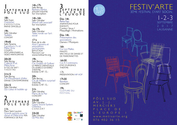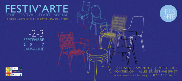 Avec plus de 50 artistes, un groupe de bénévoles et d'associations vaudoises investies, Festiv'Arte se prépare pour la rentrée! Les inscriptions pour les bénévoles sont ouvertes.... on vous attend nombreux et nombreuses.... Métis'Arte vous dit déjà un grand Merci! Bientôt plus d'infos....