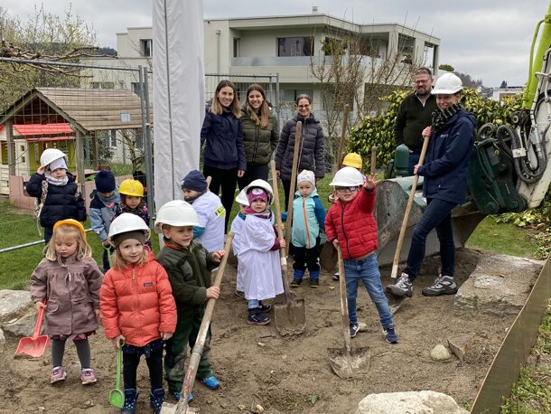 Diese Woche fand in unserem Kita-Garten der Spatenstich statt. Gross und Klein sind glücklich und stolz, dass es nun los geht mit der Neugestaltung des Gartens. Jeden Tag gibt es im Garten viel Neues zu entdecken - Handwerker, Bagger, grosse Steine, Bäume/Sträucher und vieles mehr. In einigen Wochen wird hier täglich gebuddelt, gespielt, gwässerlet usw. Unsere Vorfreude ist riesig! Herzlichen Dank an alle, die uns dies ermöglicht haben.