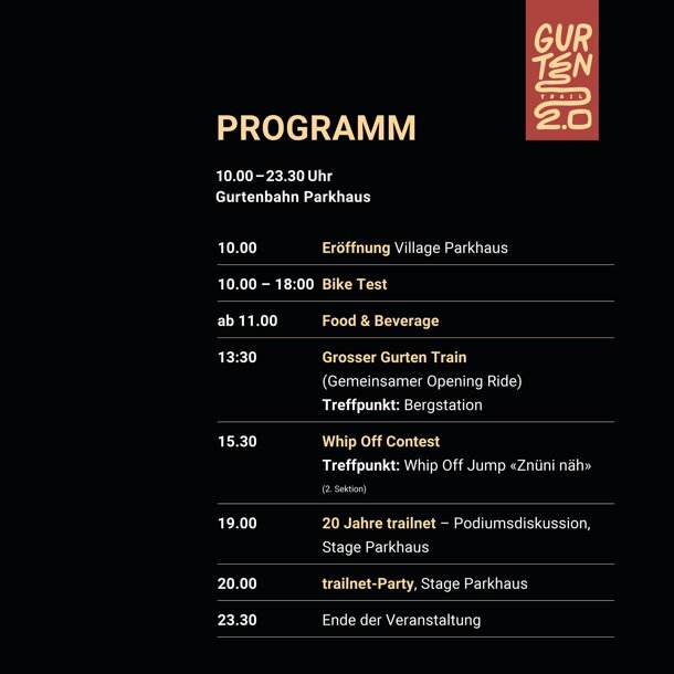 Wir freuen uns riesig, mit euch den neuen GurtenTrail 2.0 zu feiern. Das grosse Opening findet am Samstag 5. Juli direkt am Trail-Ende auf dem Parkhaus statt. Du kannst tolle Bikes bei lokalen Bike Shops testen, dich an der trailnet-Bar und bei den Food Ständen verpflegen und natürlich den neu gebauten GurtenTrail geniessen! Highlights on Trail sind der Whip Off-Contest und der Gurten-Train (gemeinsamer Opening Ride). Das Abendprogramm wird mit einer Bild-unterstützten Podiumsdiskussion zu 20 Jahren trailnet mit ehemaligen und aktuellen Protagonist:innen eingeläutet. Anschliessend findet die 20-Jahre trailnet Party statt.