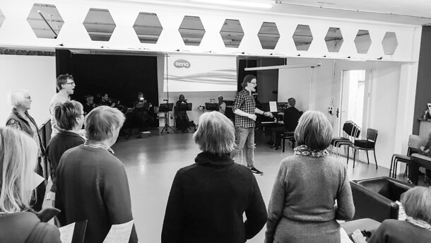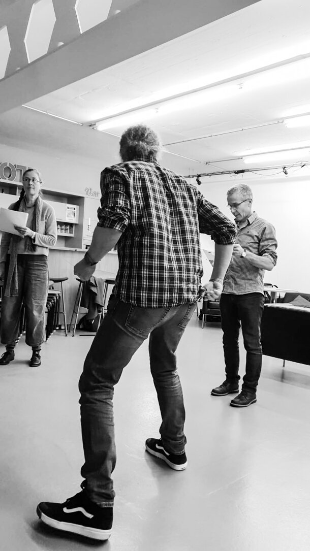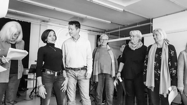 An diesem heiter bis stürmischen Tag, Samstag, dem 23. Februar, war High Noon für Chor, Orchester und Sprecher von Heimat 52. Sie trafen das erste Mal in der Musikwerkstatt Brugg aufeinander. Ziel war es, Musik, Gesang und Text mit den im Hintergrund laufenden Filmsequenzen in Einklang zu bringen. Tönt anspruchsvoll? War es auch! Aber alle Beteiligten waren begeistert dabei, lauschten hingebungsvoll den Regieanweisungen und setzten diese auch engagiert um. Zum ersten Mal konnten so nämlich alle sehen, wie das Theater einmal aussehen wird, wenn es dereinst die Bühnenreife erlangt.