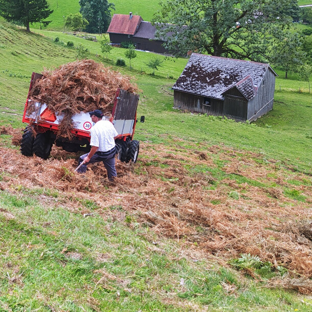 Auf den bereits gerodeten Flächen die nachgewachsenen Farnwedel wieder von Hand ausgerissen oder mit der Sense gemäht. Mit Motorsensen wurden auf zusätzliche Flächen der üppige Brombeere- respektive Farnbewuchs zurückgeschnitten. Das Mähgut wurde zusammengenommen und mit dem Ladewagen abgeführt. Gesamthaft wurden knapp 2 Hektaren (2.5 Fussballfelder) in meist steilen Lagen bearbeitet.