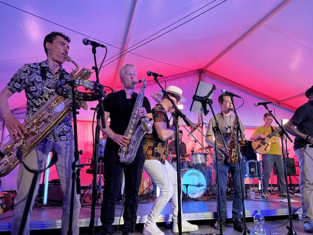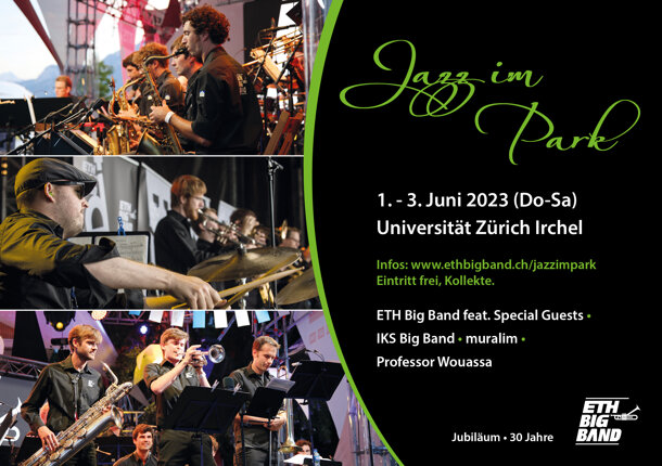 Gestern Abend wurde das Jazz im Park 2023 mit dem ersten Konzert der ETH Big Band eröffnet. Im Anschluss wurde die Stimmung von der Band "Professor Wouassa" aus Lausanne aufgeheizt und bis spätabends zu tropischen Grooves und Afrobeat getanzt. Es hat uns sehr gefreut und geehrt, dass die Eröffnung unseres Jubiläums-Festivals von Dr. Sandra Wagner, Leiterin des Rektoratsdienstes UZH sowie Prof. Dr. Günther Dissertori, Rektor der ETH Zürich mit einer kurzen Festrede umrahmt wurde. Nun geht es weiter mit zwei abwechslungsreichen Konzertabenden bei bestem Wetter und ausgelassener Stimmung. Besuchen Sie uns auf dem Campus der Universität Irchel heute und morgen ab 17 Uhr und feiern Sie mit uns! Last but not least möchte sich die Band nochmals für die zahlreichen und grosszügigen Unterstützungen aller Lokalhelden*innen bedanken. Wir freuen uns riesig, dass wir das Festival durchführen können, was ohne solche Beiträge nicht möglich gewesen wäre.