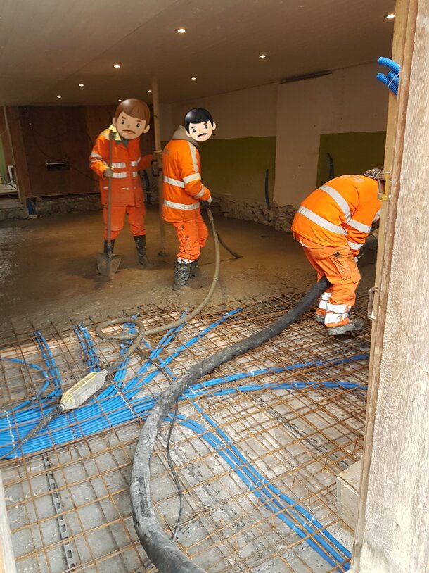 Einiges hat sich seit dem letzten Blogeintrag im alten Kuhstall getan. Anfang Jahr konnte die Bodenheizung verlegt und kurz darauf der Unterlagsboden gegossen werden. "Peut-à-peut" entsteht die Kinderwerkstatt. Die Wände sind schon fast fertig isoliert, der Raum für die Toilette ist definiert und täglich wird geschraubt, gesägt und restauriert.