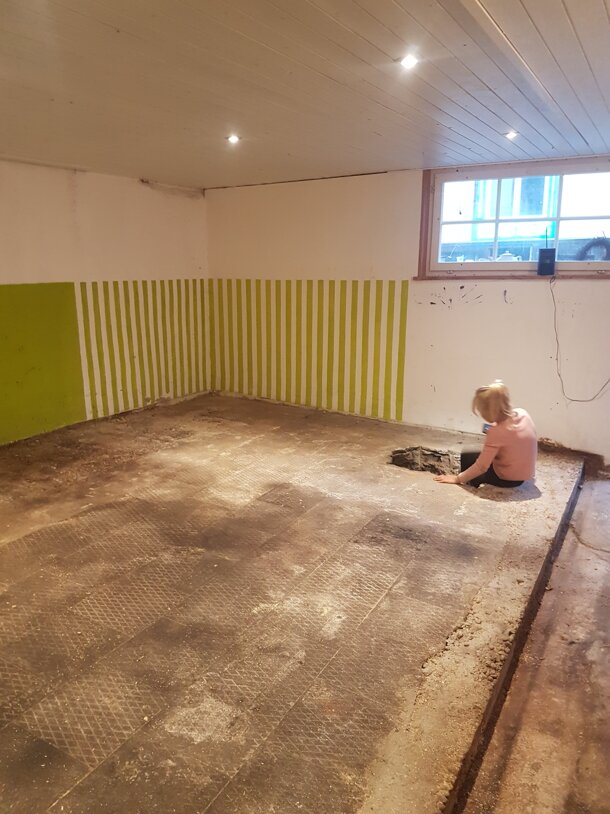 Kaum sind die 25t Schutt mühsam "usägarettlet"..sind sie schon wieder drin. Es geht voran: Der Betonboden ist gegossen. Auch die Innenausstattung nimmt Form an. Toller Fund in Basel: "Richtige" Werkbank in Kindergrösse