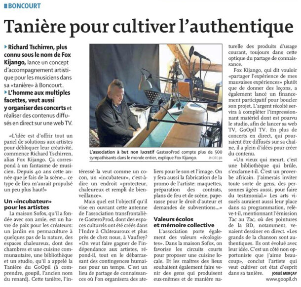 Un bon papier de Josué Merçay (merci!) dans le Quotidien Jurassien du jour. On y explique le concept et les projets. Un coup de pouce pour notre collecte aussi, rejoignez nous, nous avons besoin de vous pour finaliser ce beau projet qui profitera autant aux artistes qu'au public. Il reste peu de temps pour réussir cette collecte et nous comptons sur vous pour diffuser le plus largement notre demande de soutien Un grand merci à vous tous pour votre soutien et votre bienveillance Fox pour GasteroProd