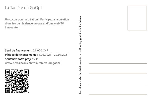Salut à toutes et à tous. Il ne reste déjà plus que 22 jours et nous n'avons pas encore atteint le premier objectif de 10'000 chf., celui qui nous permettrait de pouvoir toucher l'argent. Il est urgent de faire circuler l'information et le lien de cette collecte au plus de gens possible. visite rapide de La Tanière du GoOpil https://www.lokalhelden.ch/fr/la-taniere-du-goopil Le succès de ce projet dépend beaucoup de ces derniers investissements pour pouvoir pleinement être réalisé. GasteroProd et ses membres comptent sur vous pour porter le message le pus largement possible. Merci de votre soutien et de votre engagement! Fox pour GasteroProd