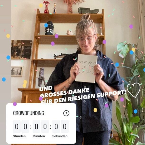 meine lieben unterstützer*innen! das crowdfunding wurde mit einem überschuss von 1434 beendet! ihr seid der wahnsinn! danke danke danke für diesen grossen support und das interesse an «mehr ist mehr»! das buch ist korrigiert und startklar für den druck. der druck dauert etwa 9 tage. ich werde die auflage erhöhen und einfach soviele drucken wie das geld erlaubt. das ermöglicht einen grossen stock an büchern, den ich in läden und vielleicht auch mal auf einer messe anbieten kann. ich freu mich sehr! ich melde mich wieder wenn die bücher gedruckt sind mit einem update. herz! kooni