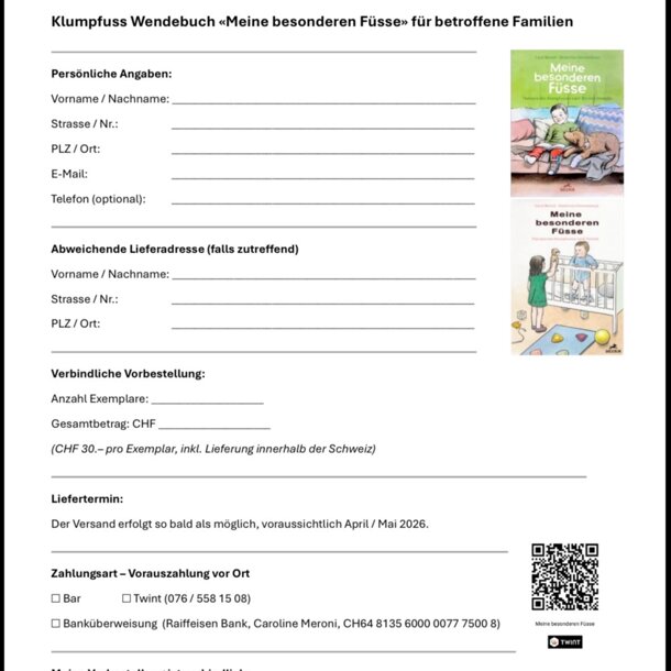 Ich freue mich sehr, mitteilen zu dürfen, dass das Klumpfuss-Wendebuch ab sofort vorbestellbar ist! Was lange eine Idee, ein Wunsch und ein Herzensprojekt war, nimmt nun täglich konkretere Formen an. Dank Eurer grossartigen Unterstützung und dem Entgegenkommen des Verlages. Geplant ist diese Geschichten auf den kommenden Frühling ((April/Mai 26) in kleinen und grossen Händen legen zu können. Die Vorbestellung des Buches ist ab sofort, direkt bei mir oder beim Verlag, möglich. carol@meroni.me oder 076/ 558 15 08 Mein Spezialpreis für Euch bis Ende März: CHF 30.– inkl. Lieferung innerhalb der Schweiz. Herzliche Grüsse Carol Meroni