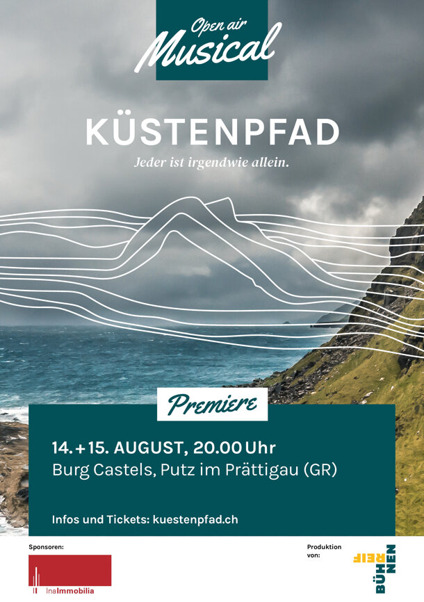 Liebe Küstenpfadfreunde Wir sind im Endspurt! 14./15.8. findet die Premiere Openair auf der Burg Castels in Putz/GR statt! Den Titelsong gibt es neu als Musikvideo. Und es gibt noch freie Daten für spontane Veranstalter! Wir proben fleissig, die Filme sind in der Postproduction und die Organisation geht in die heisse Phase. Die Premiere am 14./15. August wird für uns alle ein ganz besonderes Erlebnis! Einerseits weil es so passend ist Küstenpfad draussen zu erleben: eine Outdoorgeschichte openair! Andererseits weil es so nicht selbstverständlich ist, dass Küstenpfad lebt. Ohne deine Unterstützung via Lokalhelden wären wir irgendwann im Mai gestrandet. Du hast es möglich gemacht, dass in diesem speziellen Jahr Kunst stattfindet, eine ermutigende Geschichte erzählt wird und Kunstschaffende etwas verdienen dürfen. DANKE! Wir spielen im September noch in Domat/Ems, Sargans und Cazis und im Oktober in Glarus. Einige weitere Vorstellungen sind noch in Planung. Wir haben auch noch freue Daten für dich! Lade uns doch ein und schenk den Menschen in deinem Umfeld ein ganz besonderes Musicalerlebnis! Wenn dir das eine Schuhnummer zu gross ist, kannst du uns weiter unterstützen indem du Werbung machst für die Aufführungen, den Titelsong teilst, einen Gutschein verschenkst oder dir selbst ein Ticket kaufst. Und 2020 ist erst der Anfang. Wir werden auch 2021 in der Schweiz auf Tour sein. News und Infos immer wieder auf kuestenpfad.ch Liebe Grüsse und hoffentlich bis bald Maya Heusser und das Küstenpfadteam